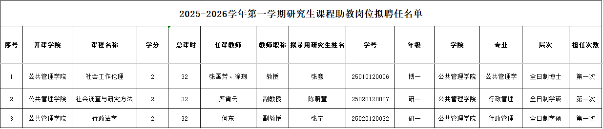 根据校研究生院“关于研究生申请担任2025-2026学年第一学期助教岗位的通知”要求, 现将“2025-2026学年第一学期研究生课程助教岗位拟录用研究生”(第二批)公示如下。 公示时间为:2025年9月28日—2025年10月3日。如有异议,请在公示期内反馈,联系电话:28008329,邮箱:chinagcjian@163.com。
